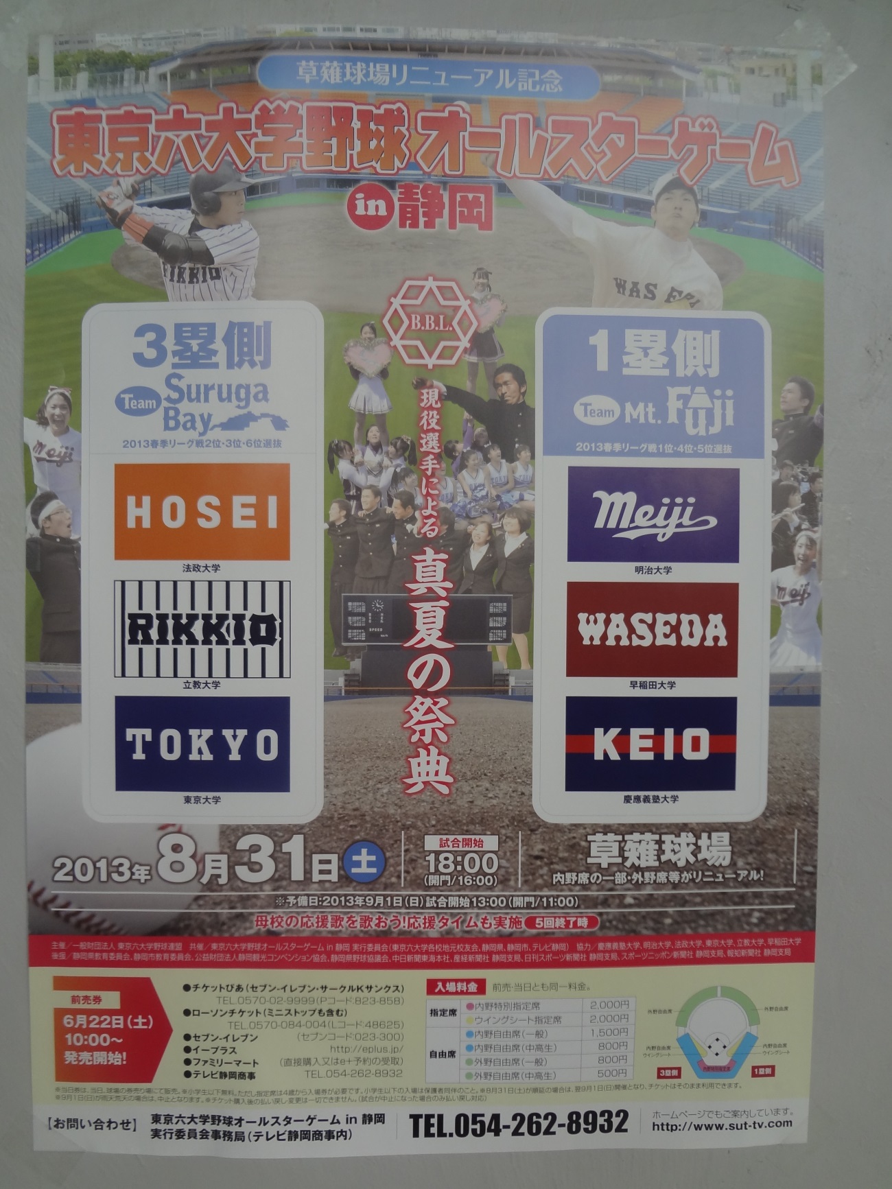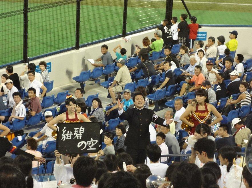 日本への台風接近の影響でお天気が心配された平成25年8月31日(土)。この日に、静岡県の草薙球場において、「東京六大学野球オールスターゲーム」がナイターで開催されました。これは草薙球場がリニューアルされたことを記念して開催されたもので、我々「明治大学平成白熱党」の面々も応援に馳せ参じたところです。