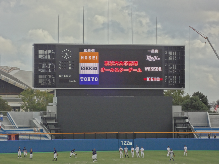 この試合は、東京六大学の各校野球部の現役選手で構成されるチームにより開催されました。先攻3塁側が「法政大学・立教大学・東京大学」の混成チーム。後攻1塁側が「我らが母校明治大学・早稲田大学・慶應義塾大学」の混成チームです。普段、神宮球場では好敵手として奮闘する各校ではありますが、今回は共に仲良く楽しく素晴らしいゲームを展開してくれました。