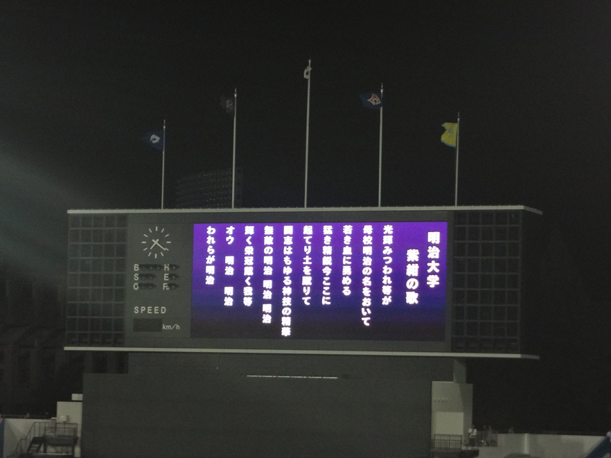 ところで、球場スタンドの応援席の風景について。1塁側・3塁側のスタンドともに、多くの観客が足を運ばれていました。東京六大学のOB・地元静岡を拠点とする六大学各大学の校友会、そして一般の方々等、実に多くの方々が観戦に訪れていました。各大学応援団が入り乱れての応援。どのような応援が繰り広げられるのか私も楽しみにしておりました。まずは、試合開始前に法政大学と母校明治大学が、7回表裏に立教大学と早稲田大学、試合終了後に東京大学と慶應義塾大学の順に六校の校歌斉唱・エール交換が行われました。神宮球場においてでさえ、一度に六校の校歌が斉唱され、聞くことはできないだけに、草薙球場に響き渡る六大学の校歌は誠に素晴らしいものでした。また、試合中のスタンド応援も最高でした。我々3塁側の場合、1・4・8回は明治大学応援団、2・5・7回は早稲田大学応援部、3・6・9回は慶應義塾大学應援指導部がそれぞれ応援指導を担当しました。それゆえ、その回は各校の応援スタイル(チャンスパターンメドレー)で応援です!得点が入るたびに観客が各校の垣根を越えて、お互いにスクラムを組んで各校の応援歌(「紫紺の歌」・「紺碧の空」・「若き血」~1塁側~)を大声で歌いあげました。