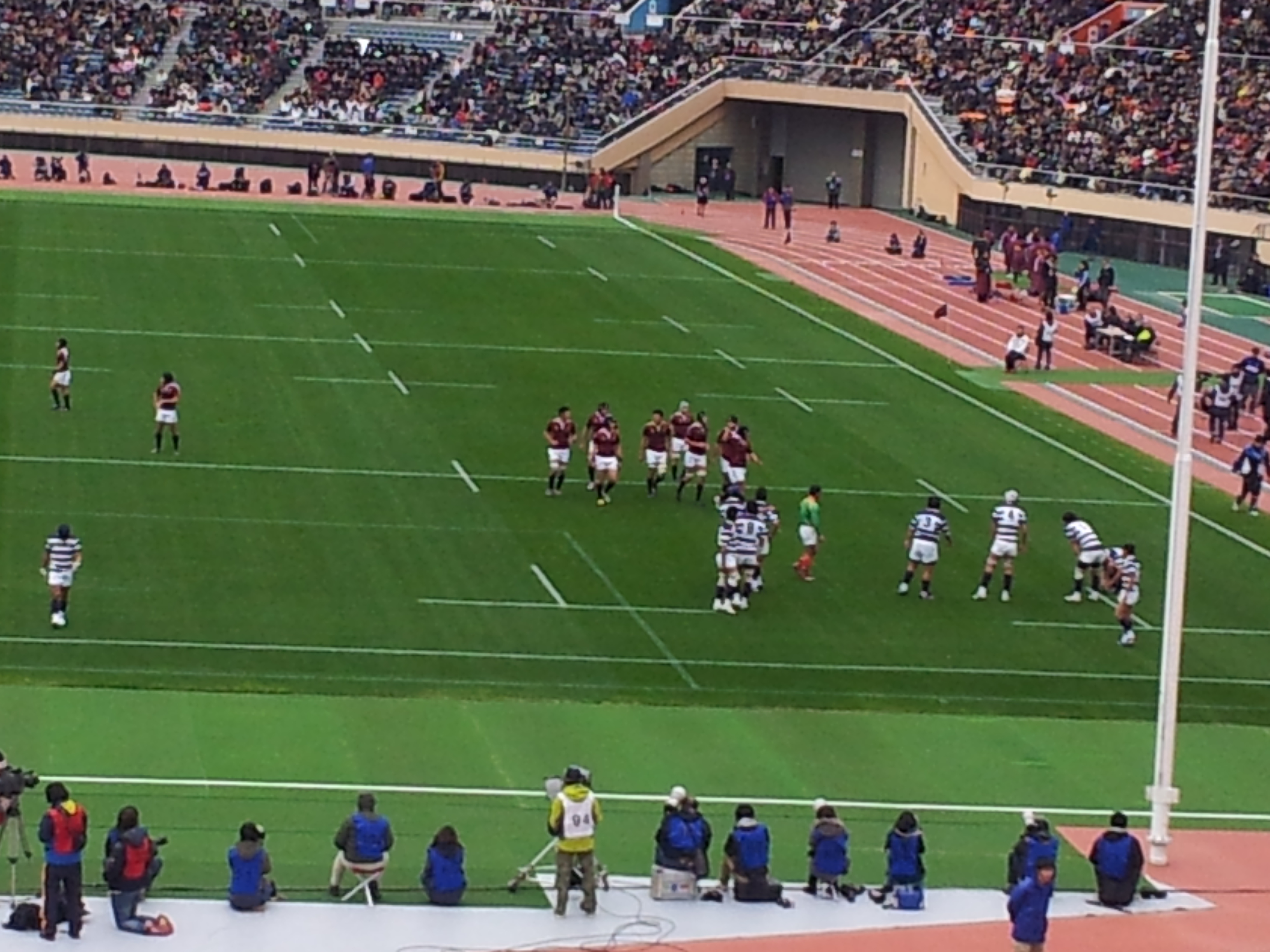 奇跡の逆転トライ、ゴールであります。無数の紫紺の旗が振られ、あちこちで歓喜の抱擁、握手、バンザイ三唱の嵐です。吉田監督のインタビューにスタンドは泣き、白雲なびく駿河台の校歌が嬉しさと感激で言葉に詰まり、ただ胸を熱くする瞬間でありました。