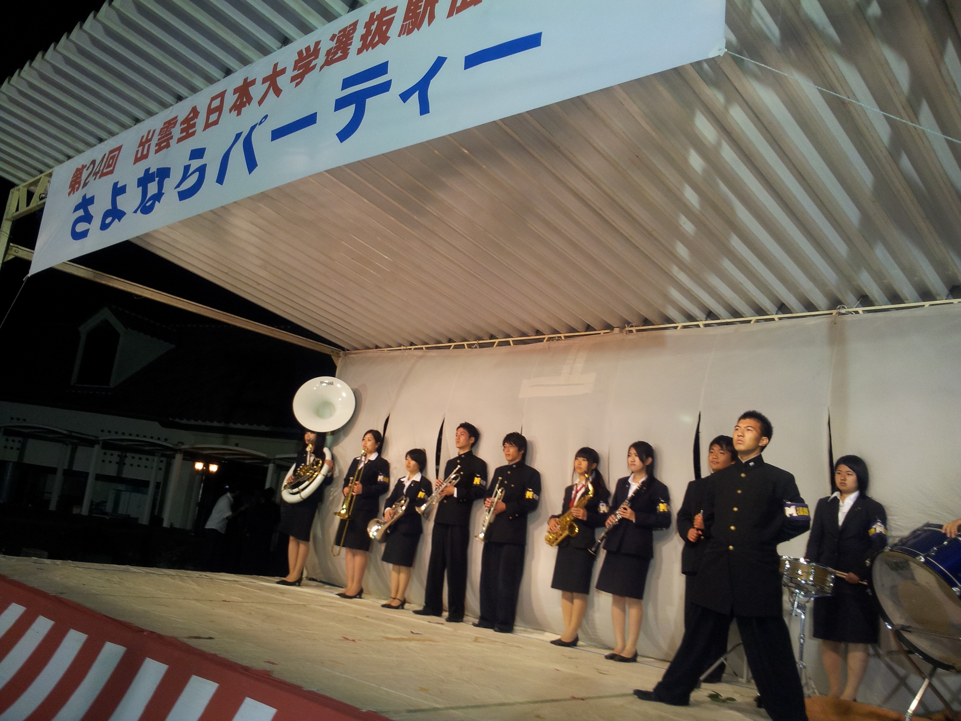 出雲駅伝は終了後、島根ワイナリーにて、各校関係者による行なわれた「出雲駅伝さよならパーティー」では、我が明治大学のステージは最高の盛り上がりを見せました。六大学の雄、明治の迫力の応援ステージは他校を圧倒。ラスト、白雲なびく駿河台の明治大学校歌の斉唱には、ステージに校友、父母会、駅伝選手が上がり、応援団の指揮の下、校歌熱唱、感動の拍手に包まれました。