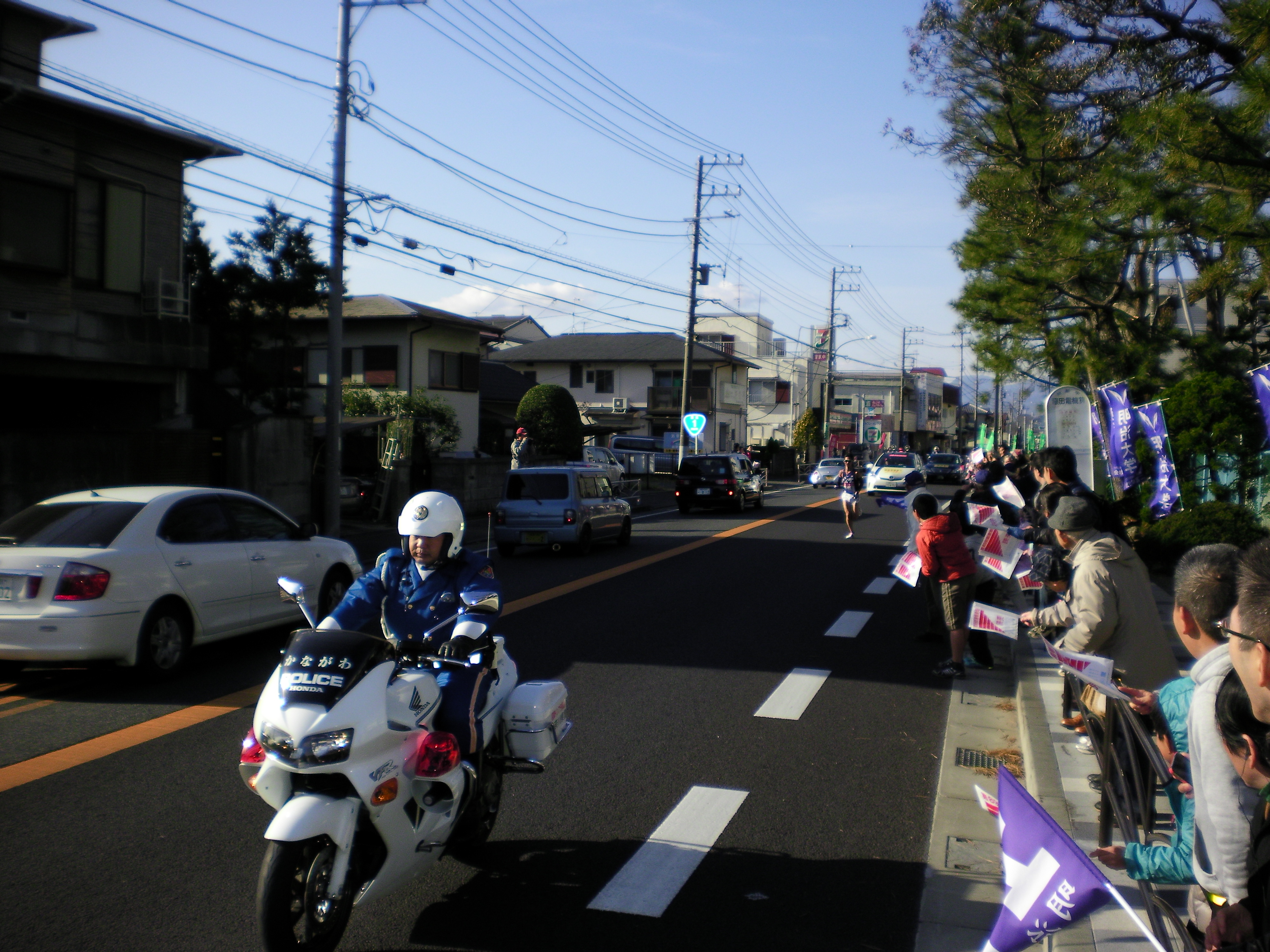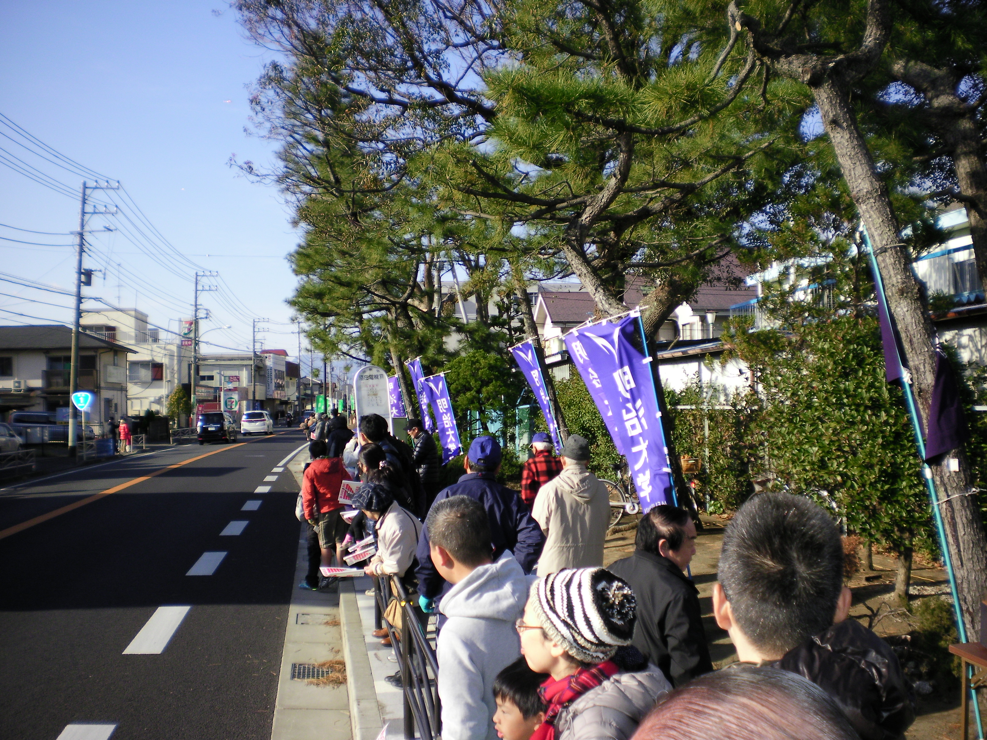 9時半過ぎに、1位の日体大の高田選手が順調に走り抜けました。次に1分近くに小田原で迫っていた東洋大が、2分ほど遅れて通過しました。その後、小田原でかなり離されていた、明治の有村君は、押切の坂を一気に駆け上り、50秒ほどに迫って、我々大応援団の前を元気に走り抜けて行きました。大磯、平塚と、東洋も明治の猛追に気付いたのか、抜き返す事無く、3位で、8区の横手 健君(栃木県出身 1年)に襷を渡しました。結局、有村君は、小田原で、4分30秒ほど離されていたが、1位の日体大を2分ほど差を詰めた力走でした。