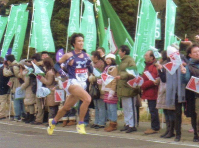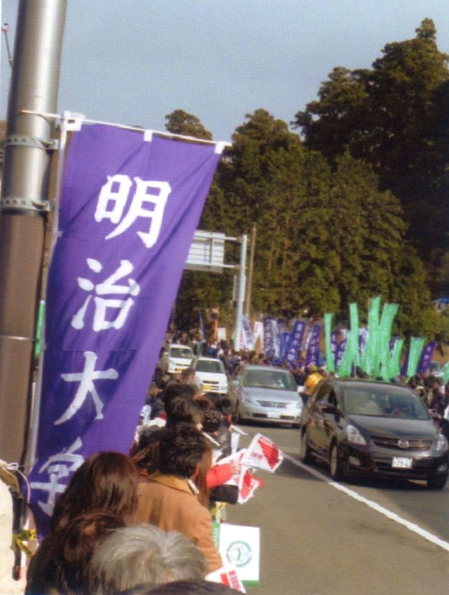 追伸:ちょうど観戦付近で他大学の応援団が二つありました。一つの応援団は自分の大学が通過するとすぐに旗を降ろし退散していく姿。もう一つの応援団は自分の大学が通過するも30分後の最後の選手が通過するまで、旗も掲げ、応援の声も出し続けている姿。対照的な応援団の姿の観戦も・・・・。