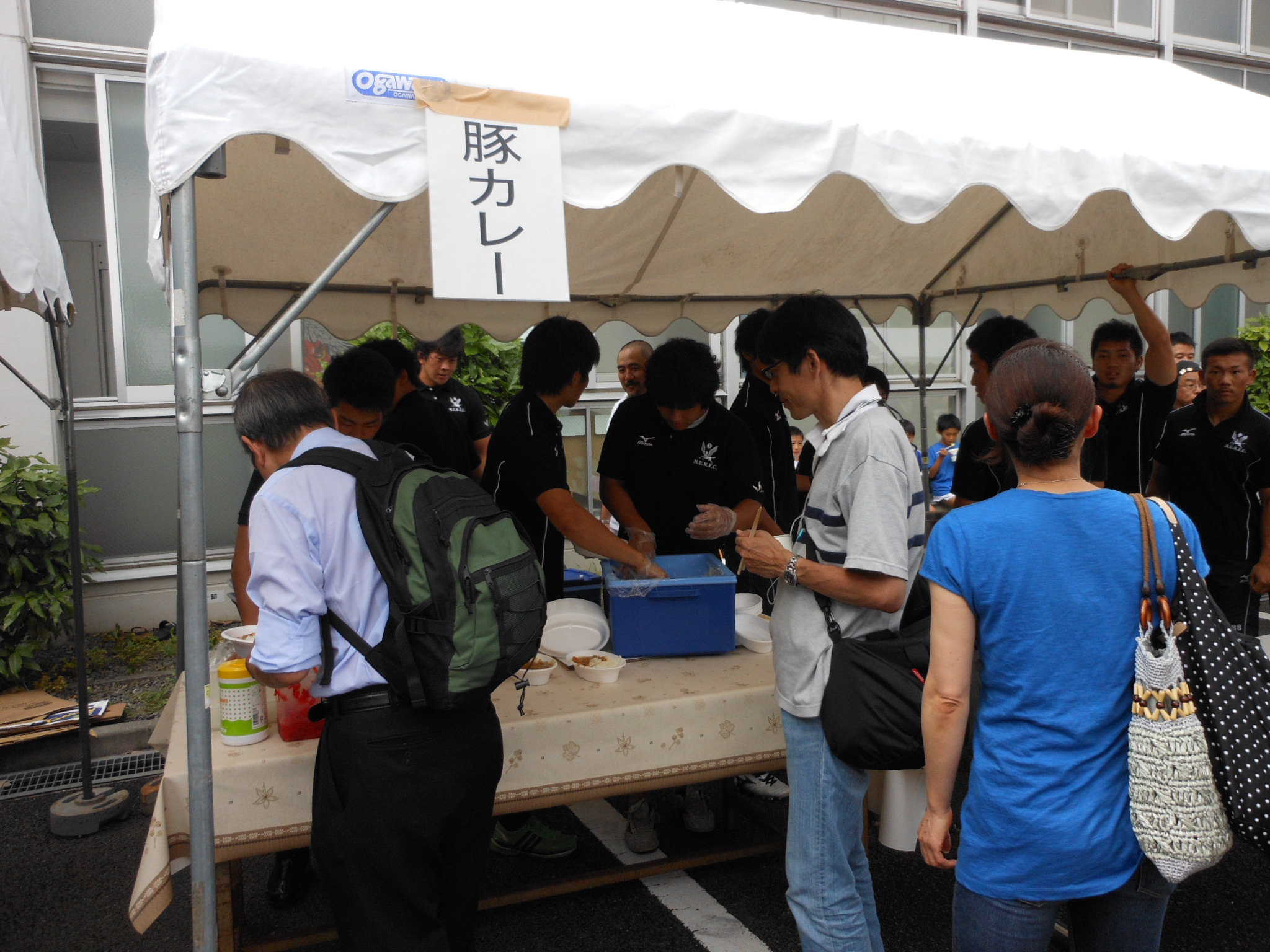 ラグビー部合宿所駐車場で行われた懇親会にも参加させて頂き焼きそばやカレー、飲み物などが振舞われ学生達の元気を感じる事ができました。