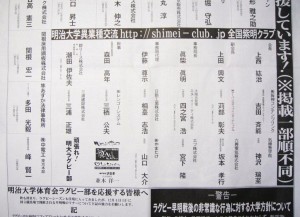 全国紫明クラブでは毎年明大スポーツの要請に応じ広告を掲載していますが、今年もおおぜいの会の役員、会員が協賛しました。