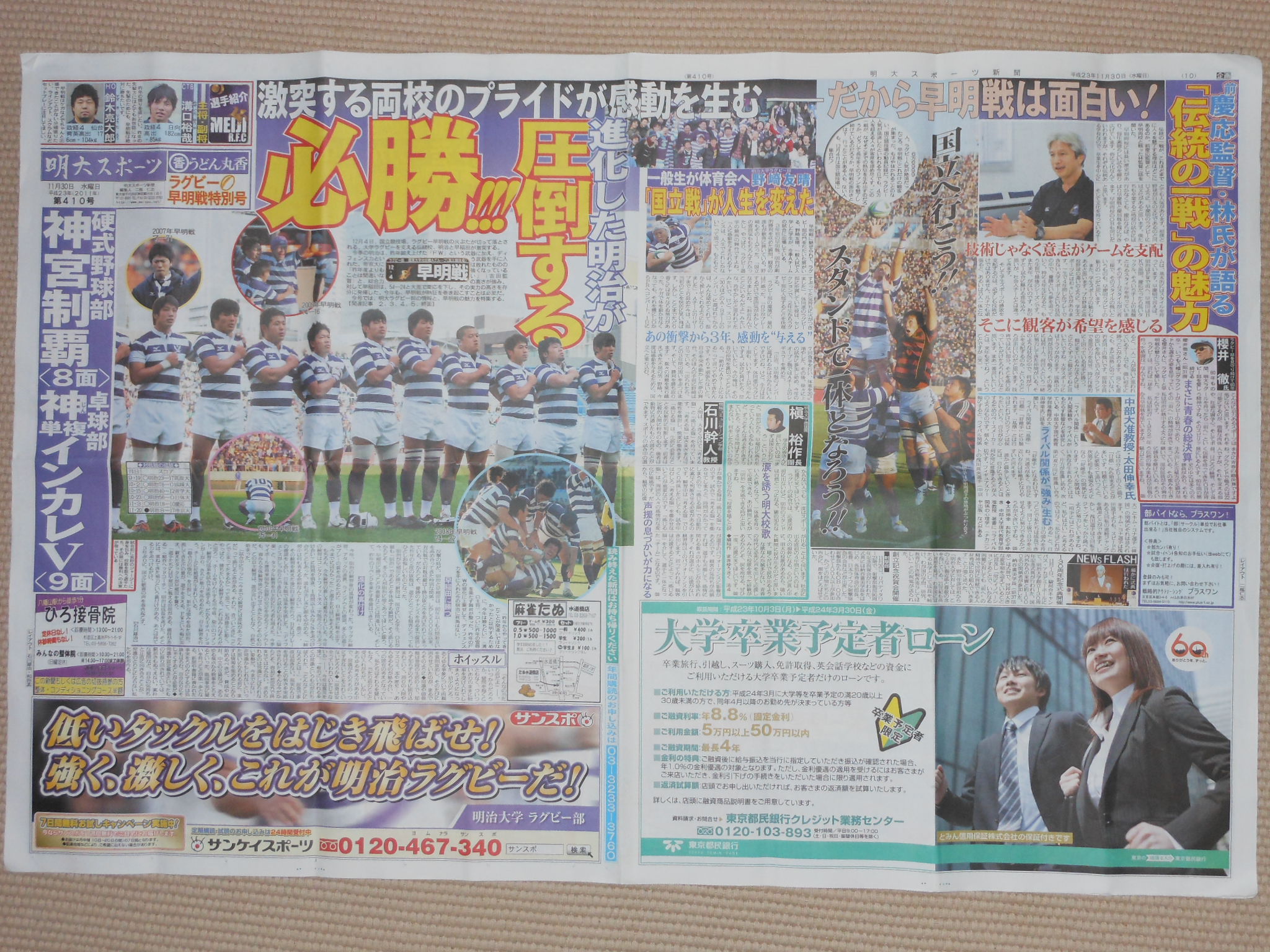 平成23年(2011年)11月30日水曜日 第410号 明大スポーツに全国紫明クラブ協賛広告が掲載されました。ラグビー明早戦特別号は、毎年12月の第一日曜日に開催される明早戦にあわせて3万部発行されますが、当日、国立競技場で2万3千部が観戦者に無料配布されます。